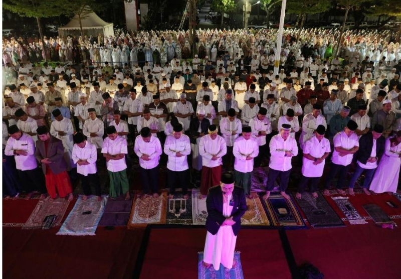 Ribuan warga tampak antusias mengisi shaf jemaah salat Subuh. Barisan jemaah memadati sayap kiri dan kanan anjungan City of Makassar.